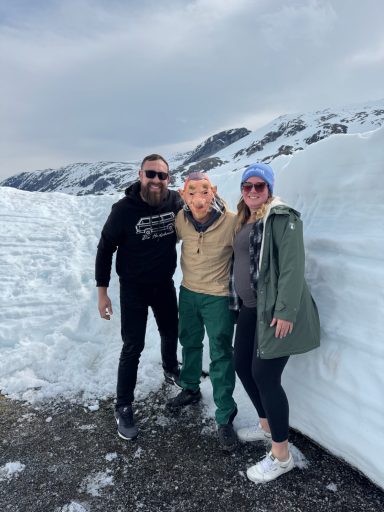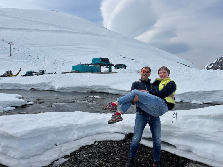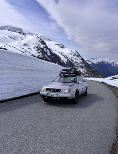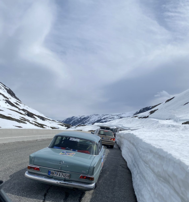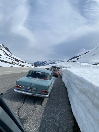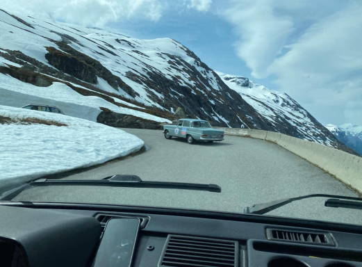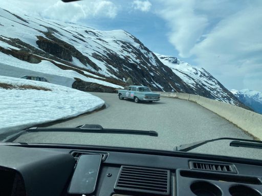 Langsam kletterten wir mit unseren Autos den Berg hinauf. Teilweise mussten wir in den 2. Gang schalten, um die steilen Anstiege zu meistern. Doch die Mühe lohnte sich, denn mit jedem Höhenmeter wurde die Aussicht spektakulärer. Die schneebedeckten Gipfel kamen immer näher, und der Schnee, durch den wir fuhren, türmte sich meterhoch an den Straßenrändern. Surreal, mitten im Juni durch eine Winterlandschaft zu fahren.