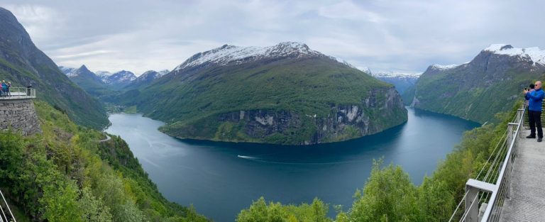 Oben angekommen, wurden wir mit Blick auf den Geiranger Fjord entschädigt. Weiter ging es unzählige Serpentinen hinunter, die meine Bremsbeläge erstmal den Rest gaben. Bei den verbleibenden Donwhill-Serpentinen musste wir vor allem die Motorbremse nutzen und nur sachte wieder die Beläge anbremsen.