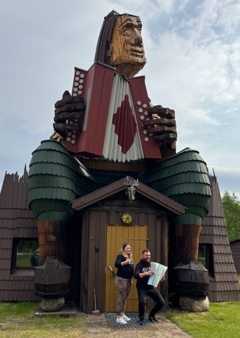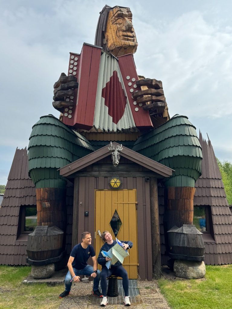 Wie es der Zufall so wollte, entdeckten wir während unserer Fahrt eine beeindruckende Troll-Statue, die uns sofort ins Auge sprang. Dieser Troll war nicht nur riesig, sondern hielt auch noch eine Ziehharmonika in den Händen – ein Anblick, der uns direkt zum Schmunzeln brachte. Natürlich konnten wir uns diese Gelegenheit nicht entgehen lassen! Also hieß es: Anhalten, aussteigen und kreativ werden.