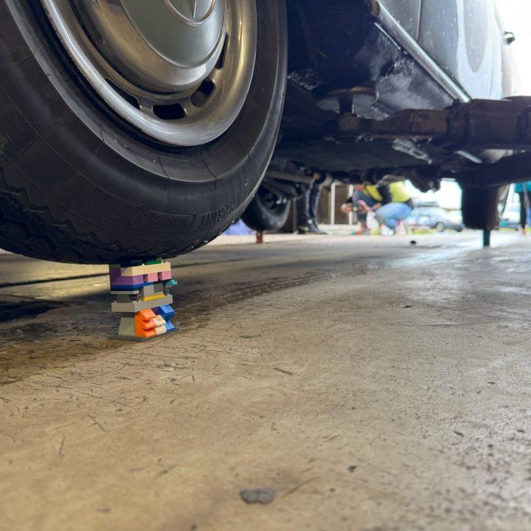 Um diese Herausforderung zu meistern, brauchten wir natürlich ein bisschen Unterstützung. Also steuerten wir eine Werkstatt an und fragten den netten Mitarbeiter vor Ort, ob wir seine Hebebühne nutzen dürften. Zum Glück war er sofort dabei – und so begann unser kleines Lego-Abenteuer.