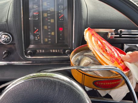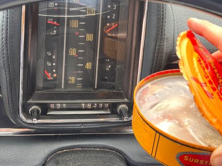 Für die Challenge-Punkte müssen wir eine geöffnete Dose mindestens 100 Kilometer im Wagen spazieren fahren. Als Beweis machen wir Fotos mit Tachostand zu Beginn und zum Ende der Fisch-Aktion.