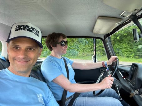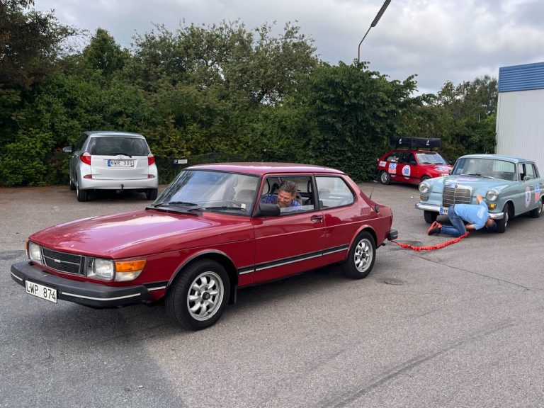 Das Roadbook stellt und vor die Herausforderung. Wir sollen uns vom einem klassischen Saab 99 abschleppen lassen.