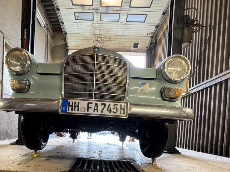 Was nun? Im Kopf wägen Juliane und ich die Alternativen ab. Absage ist keine Option! Also beschließen wir spontan von der Heckflosse auf die Mercedes Pagode zu wechseln, mit der wir allerdings noch keine längeren Touren gefahren sind.
