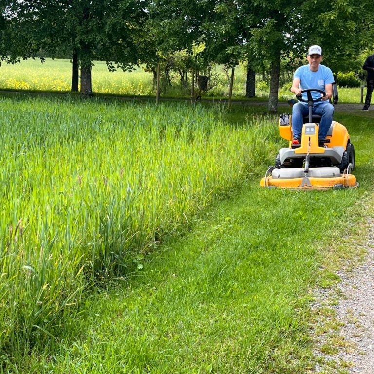 Wir bieten einem supernetten Schweden auf eine kleine Zimtschnecke ein und bieten ihm an seinen Rasen zu mähen. Kein Wunder, dass er uns direkt sympathisch findet und uns auf seinen Hof einlädt. Ich mache dann die erste Runde auf einem Aufsitzrasenmäher meines Lebens: Krass spaßig,